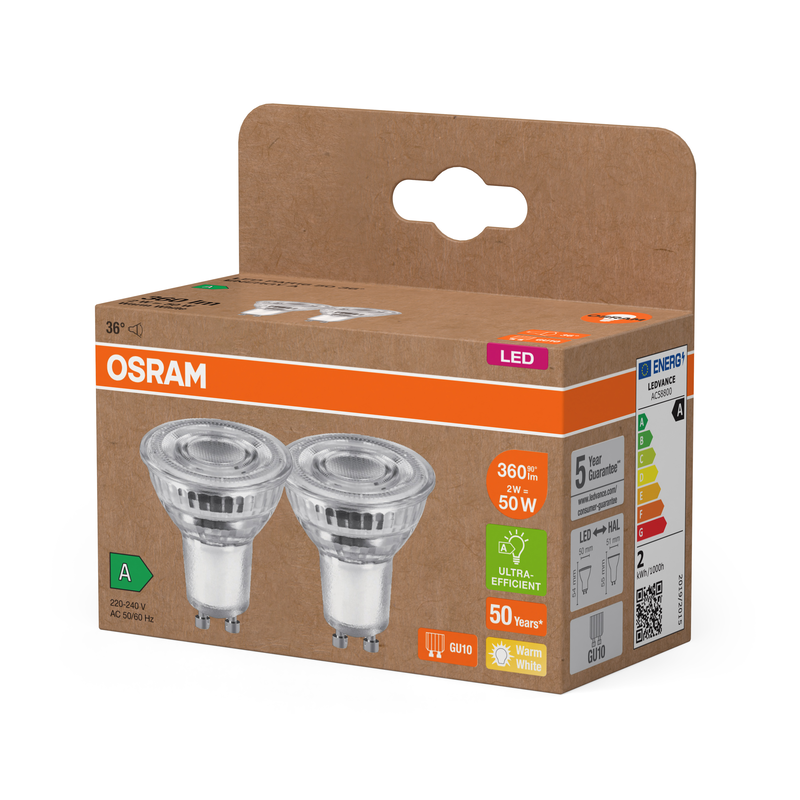Ampoule de technologie LED à culot GU10 de finition Claire d'une puissance de 2w de marque OSRAM.