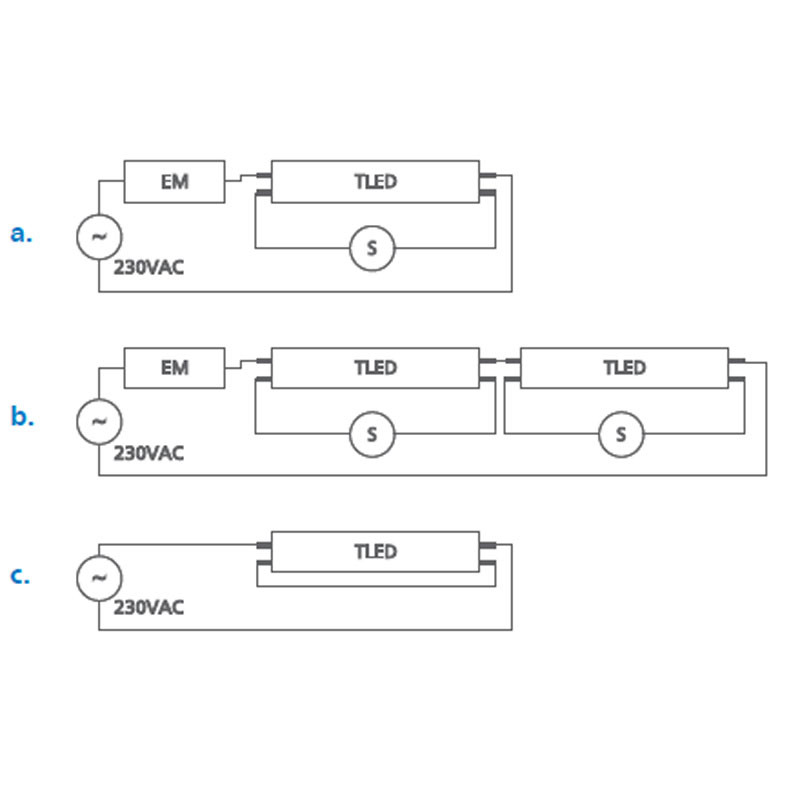 Retrofit. 1 or 2 LEDtubes connected in series to EM
